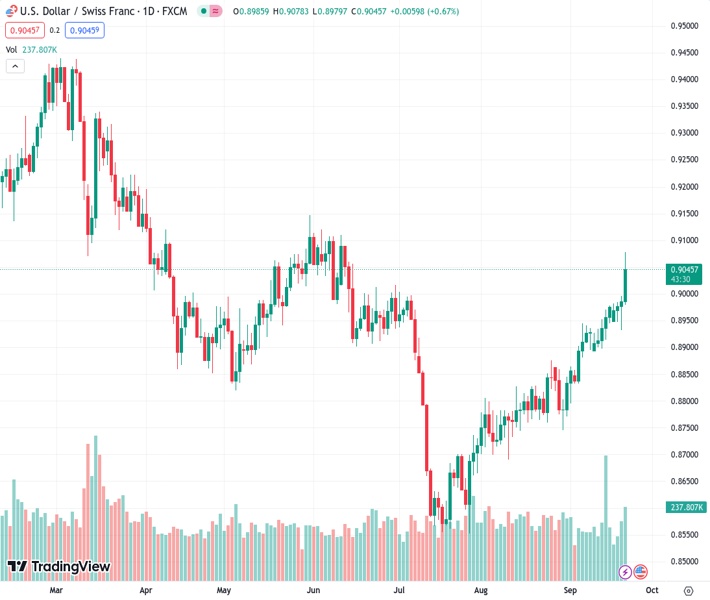 USDCHF currently trading at 0.9039 at the time of writing. Pair opened at 0.8986 and is trading with a change of 0.59 % .