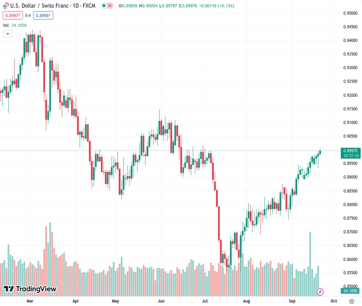 The USDCHF pair, currently trading at 0.89966, continues its upward trend that has been ongoing for two months and reaches its highest level since the end of June.