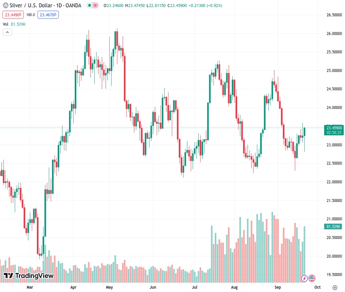 XAGUSD currently trading at 23.42 at the time of writing. Pair opened at 23.25 and is trading with a change of 0.73 % .