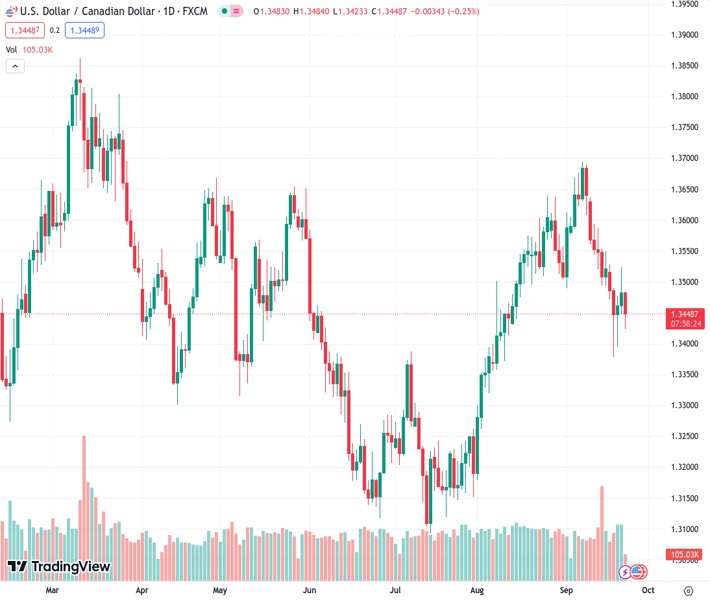 USDCAD currently trading at 1.3447 at the time of writing. Pair opened at 1.3484 and is trading with a change of -0.27 % .