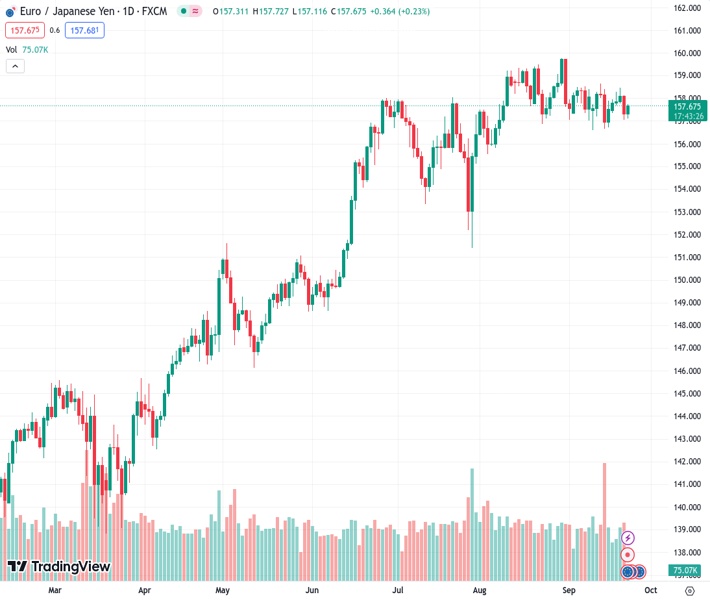 EURJPY currently trading at 157.64 at the time of writing. Pair opened at 157.39 and is trading with a change of 0.16 % .