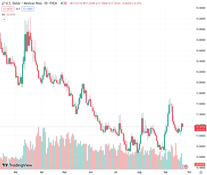 The exchange rate between the US dollar and Mexican peso, at 17.1694, rises confidently above the $17.00 mark due to the US dollar’s continued strength.