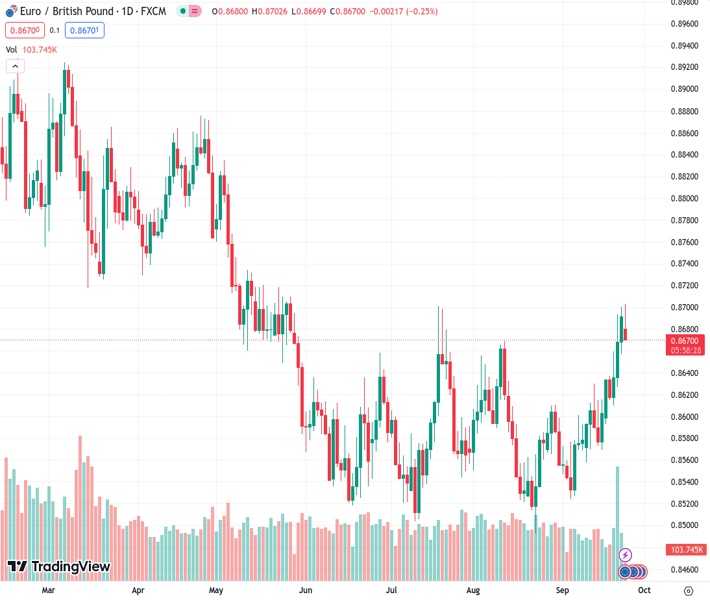 Danske Bank predicts that the EURGBP currency pair will experience a slight increase to 0.88 in the next year, starting from the current rate of 0.86712.