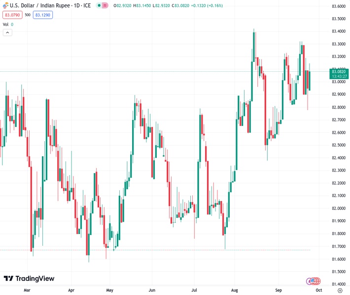 Fresh buying interest emerges in the USD/INR currency pair at a rate of 83.1075 on Monday as the bullish US dollar provides additional support.
