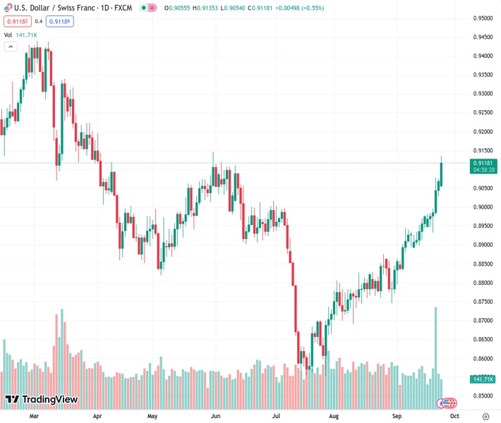 USDCHF currently trading at 0.9119 at the time of writing. Pair opened at 0.9067 and is trading with a change of 0.57 % .