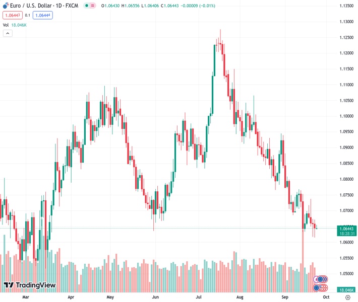 The EURUSD currency pair, currently trading at 1.06446, is stabilizing after experiencing recent declines. This level is the lowest it has reached since it was last observed in March.
