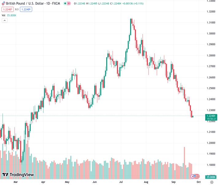 The GBPUSD currency pair, currently trading at 1.22485, is experiencing a period of bearish consolidation as it hovers close to a low point reached last Friday, which has been sustained for several months.