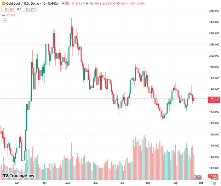 The price of gold, represented by #XAUUSD at 1,924.13, is struggling to maintain its momentum around the $1,920 level and remains below the 50- and 100-hour exponential moving averages (EMAs).