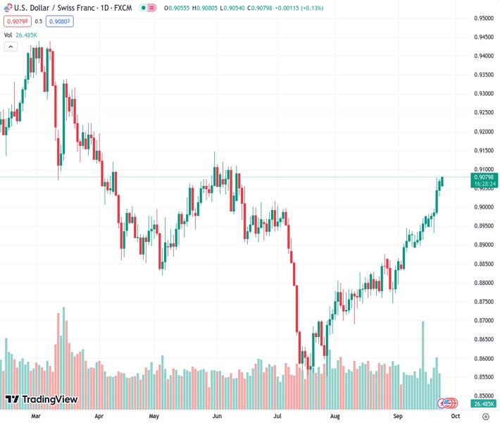 The USDCHF pair, currently at 0.90797, is rising to a new high that hasn’t been seen in several months. This climb is being fueled by a mix of various factors that are providing the currency with support.