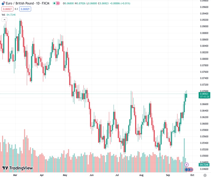 EURGBP currently trading at 0.8695 at the time of writing. Pair opened at 0.8696 and is trading with a change of -0.01 % .