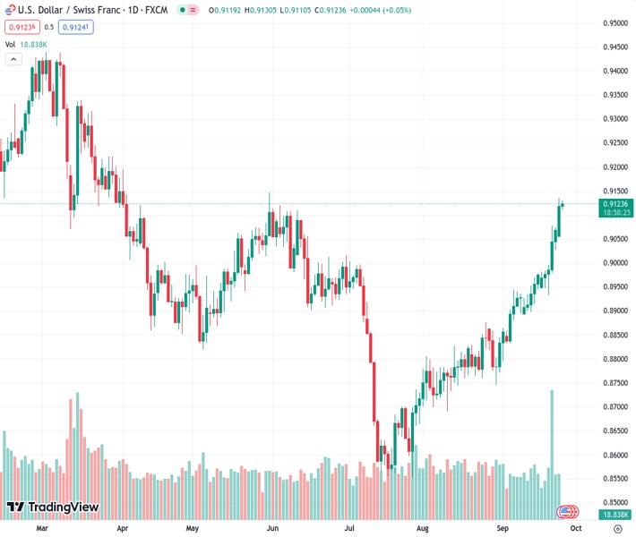 The USDCHF pair is currently at 0.91241 and is maintaining a strong position close to its highest level in several months. It continues to receive solid backing from a variety of factors.