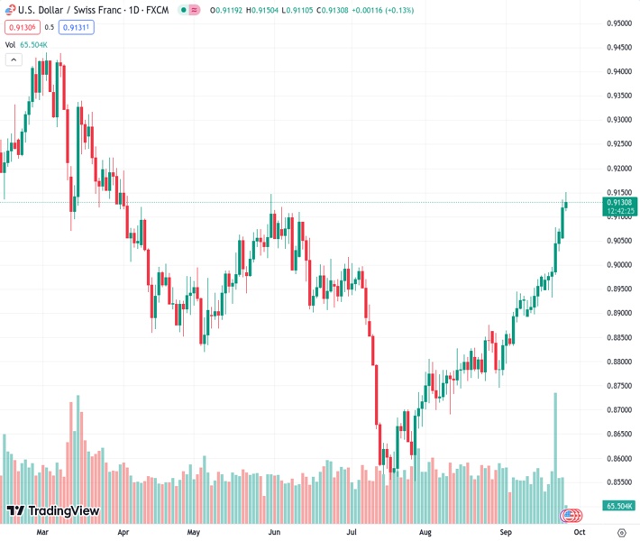 USD/CHF continues the winning streak that began on September 19 and reached the five-month high. The spot price is trading near 0.9140 during the early trading hours of the European session on Tuesday.