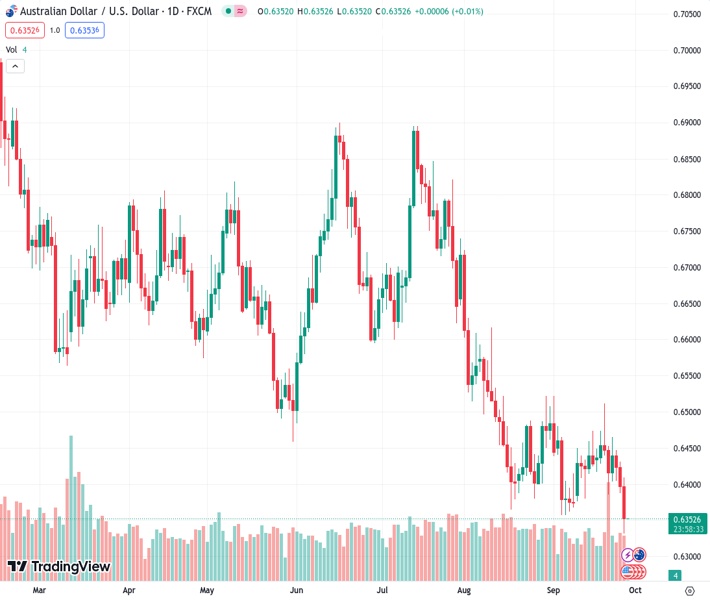 The AUD/USD slipped to a ten-month low of 0.6331 in late Wednesday trading and is currently down around 45 pips, or -0.7%, for the day near 0.6350.