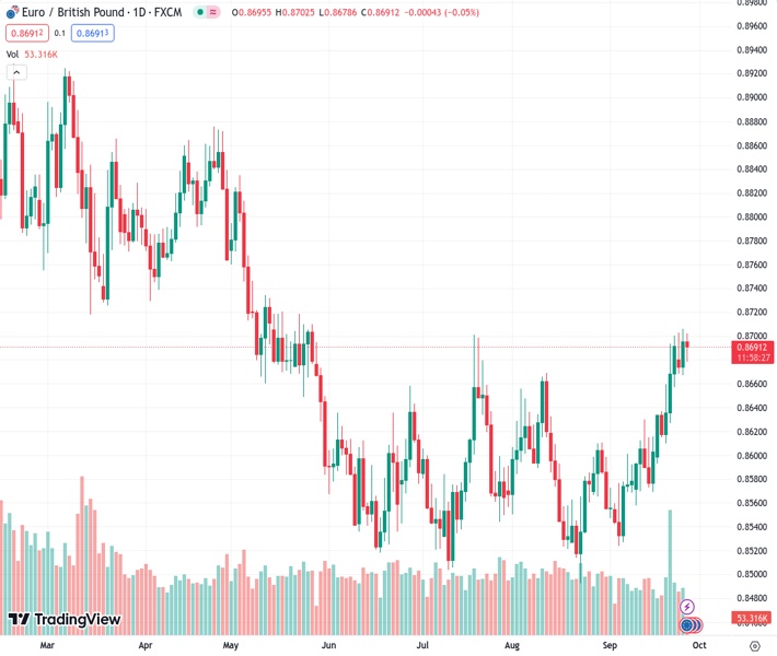 EURGBP currently trading at 0.8691 at the time of writing. Pair opened at 0.8696 and is trading with a change of -0.06 % .