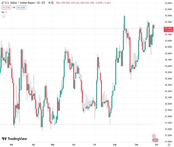 USDINR currently trading at 83.2365 at the time of writing. Pair opened at 83.4188 and is trading with a change of -0.22 % .