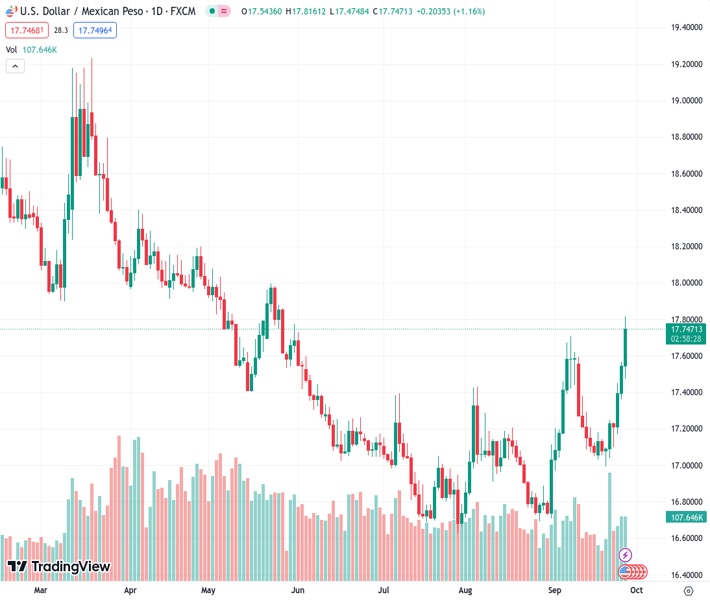 The US dollar to Mexican peso exchange rate, represented as USDMXN at 17.7429, has sharply increased to reach new highs within its current cycle. This was driven by risk aversion in the market and the strength of the US dollar.