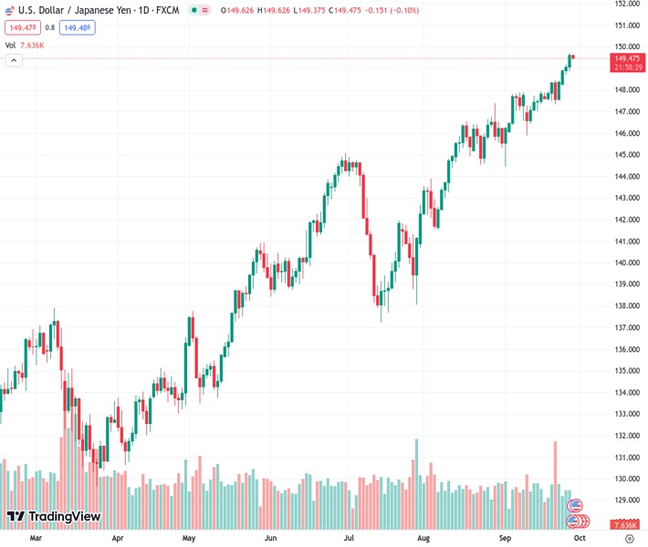 The USDJPY currency pair has climbed further from 149.475 to around 159.50 due to increasing demand for the US dollar.