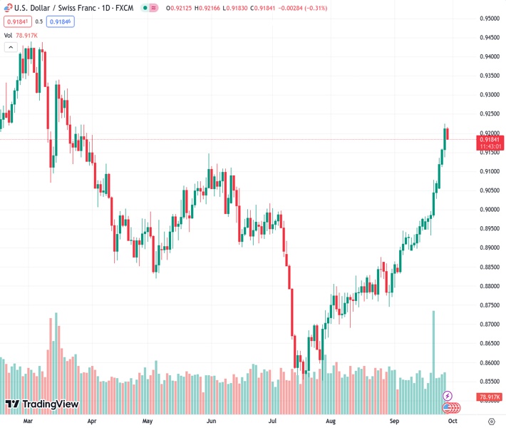 USD/CHF pulls back from the six-month high marked on Wednesday, trading around 0.9190 during the European session on Thursday. The Swiss Franc (CHF) is receiving upward support, and this may be attributed to a recent analysis by economists at ANZ Bank. Their analysis has highlighted that the CHF has become the top-performing currency among the G10 currencies in relation to the US Dollar (USD).