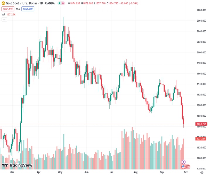 XAUUSD currently trading at 1864.45 at the time of writing. Pair opened at 1874.92 and is trading with a change of -0.56 % .