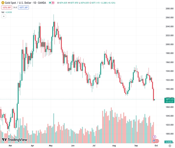 On Thursday, the gold price continues to drop, reaching $1,875.