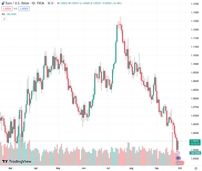 The EURUSD currency pair bounces back from its lowest point in eight months around 1.0490, trading at 1.05496.