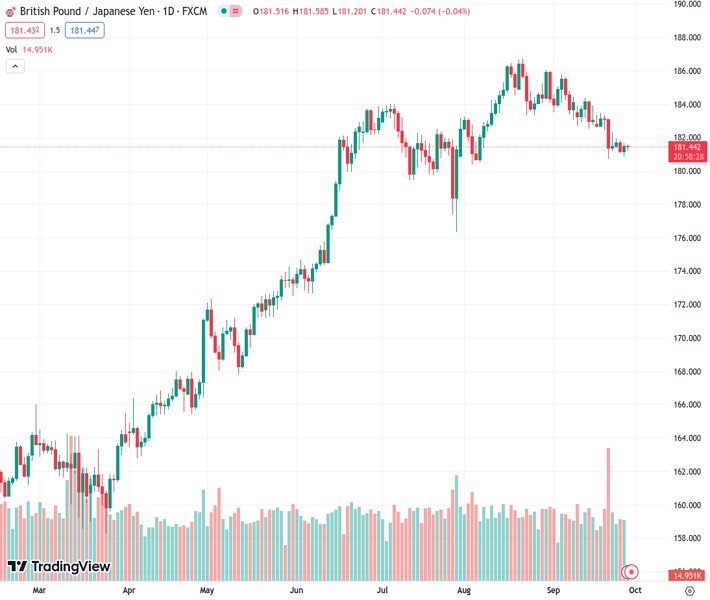 The GBP/JPY continues to struggle to push decisively in either direction and has been constrained between the 182.00 and 181.00 major levels for the past week despite being down 1.7% for September.