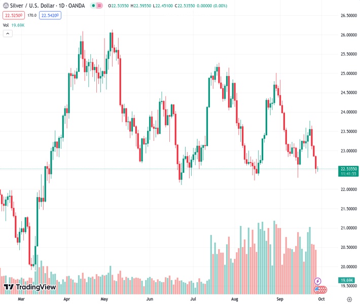 The price of silver, represented by the symbol #XAGUSD, is currently trading at 22.522. It is holding steady within a certain range, slightly above the lowest point it reached in almost two weeks, which occurred on Wednesday.
