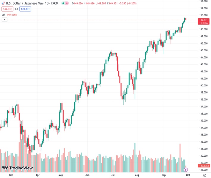 USDJPY currently trading at 149.26 at the time of writing. Pair opened at 149.64 and is trading with a change of -0.25 % .