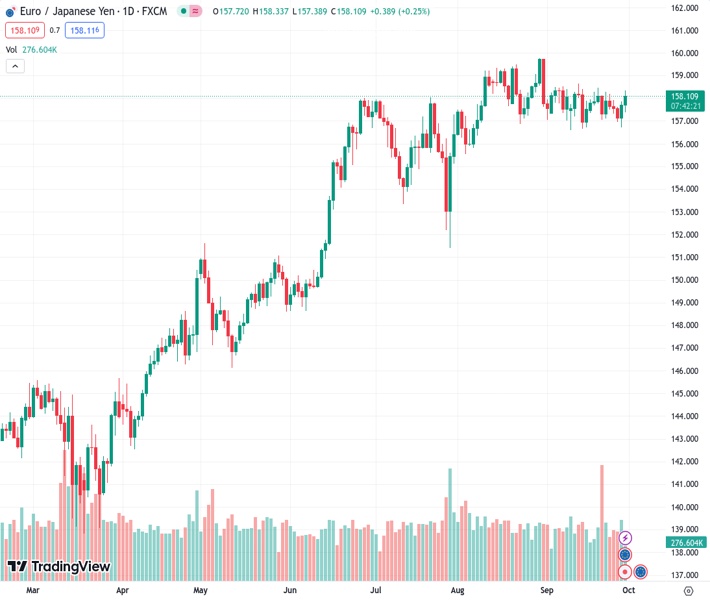 EURJPY currently trading at 158.14 at the time of writing. Pair opened at 157.77 and is trading with a change of 0.23 % .