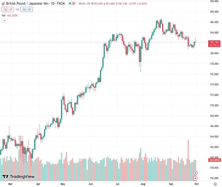 The pair has seen a slow bleed from August’s peaks near 186.77, but still remains firmly in bullish trend territory with the 200-day SMA far below price action near 172.00.