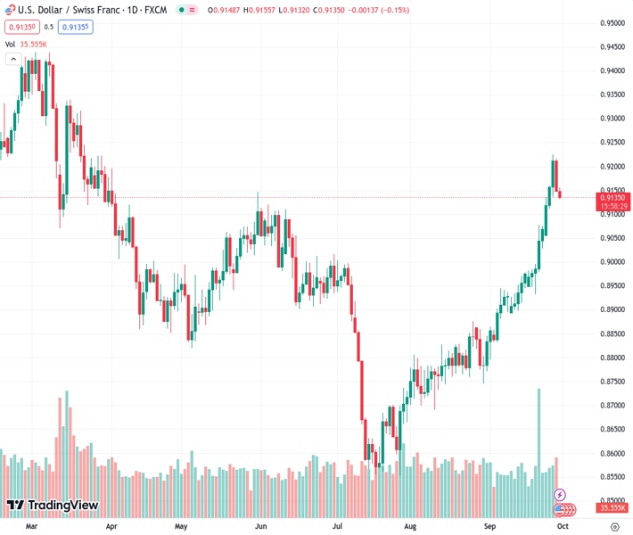 The USD/CHF pair retreats from its peak levels since March, currently standing at 0.91357.