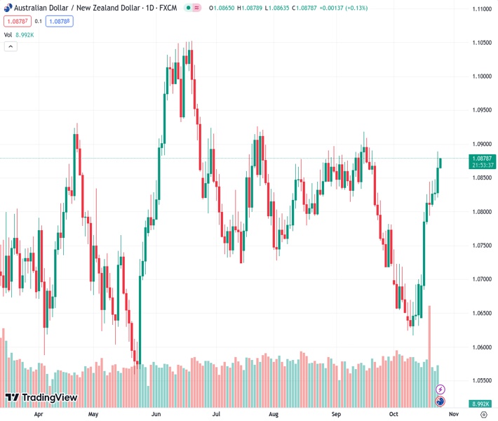 AUDNZD currently trading at 1.0877 at the time of writing. Pair opened at 1.0839 and is trading with a change of 0.35 % .