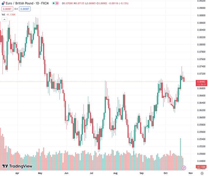 EURGBP currently trading at 0.8702 at the time of writing. Pair opened at 0.871 and is trading with a change of -0.09 % .