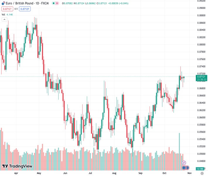 EURGBP currently trading at 0.8711 at the time of writing. Pair opened at 0.871 and is trading with a change of 0.01 % .