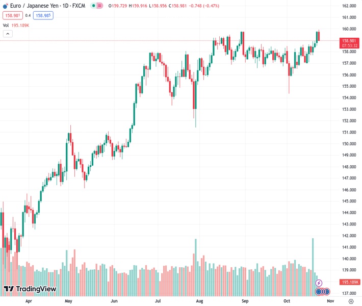 EURJPY currently trading at 159.13 at the time of writing. Pair opened at 159.77 and is trading with a change of -0.4 % .