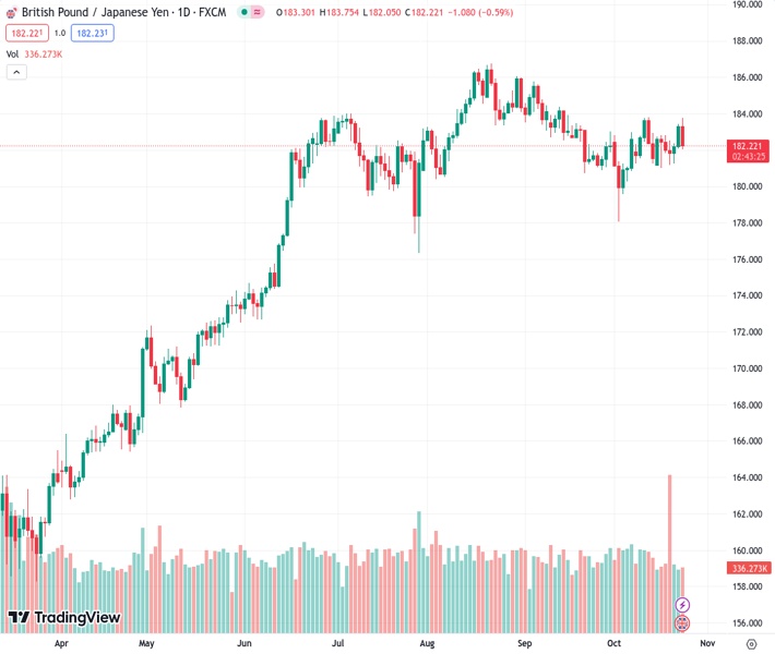 GBPJPY currently trading at 182.31 at the time of writing. Pair opened at 183.38 and is trading with a change of -0.58 % .