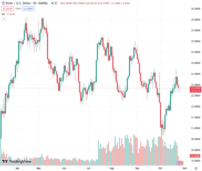 #XAGUSD @ 22.853 Silver price corrects sharply below $23.00 after recovery in the US Dollar and bond yields.