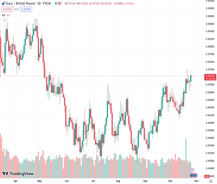 EURGBP currently trading at 0.8725 at the time of writing. Pair opened at 0.8709 and is trading with a change of 0.18 % .