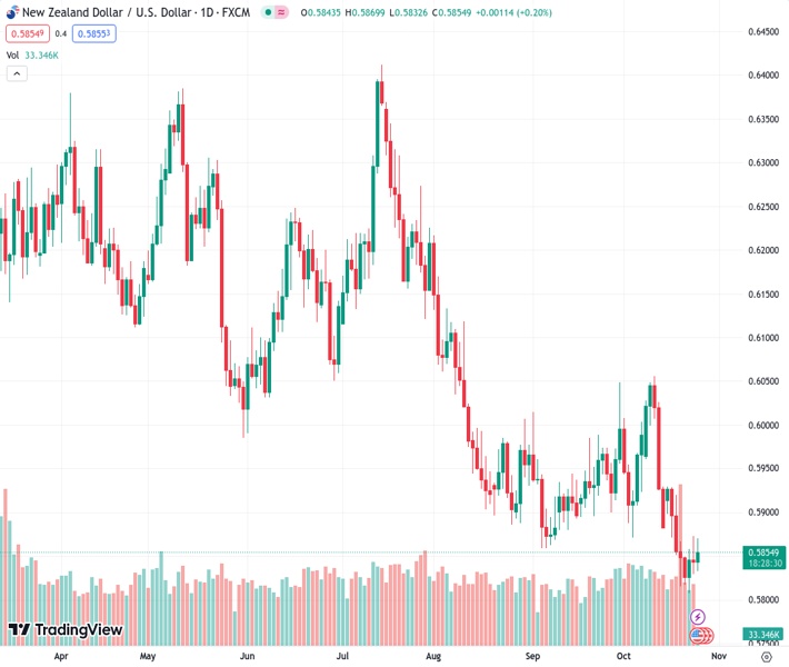 NZD/USD retraces recent losses, trading at around 0.5860 during the Asian session on Wednesday. The uptick is influenced by improved risk sentiment, with the postponement of Israel’s ground assault plan in Gaza contributing support to the pair.