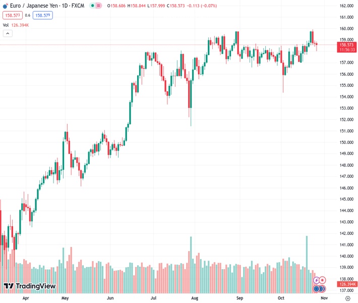 EURJPY currently trading at 158.58 at the time of writing. Pair opened at 158.64 and is trading with a change of -0.04 % .