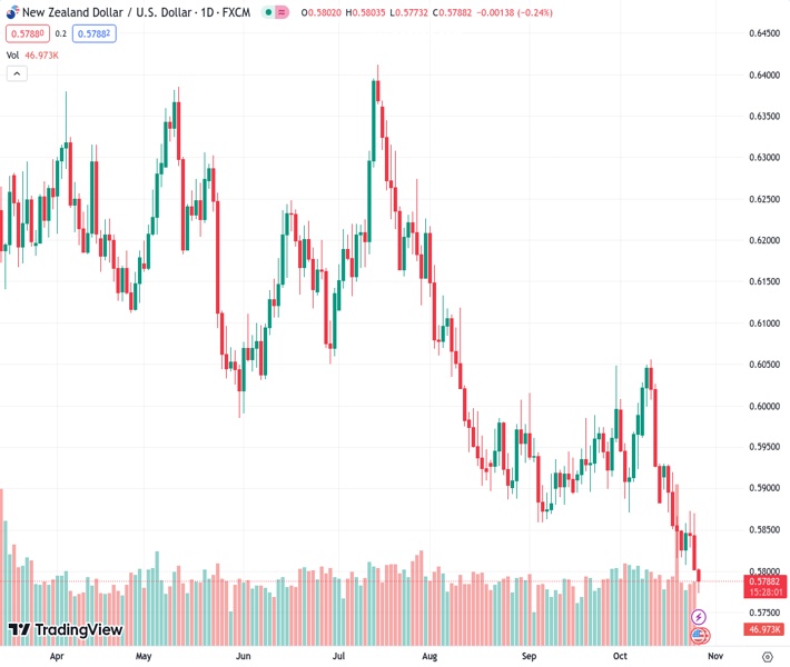 NZD/USD marks an 11-month low, hovering around 0.5790 during the Asian session on Thursday. The pair could reach November’s low during the session.