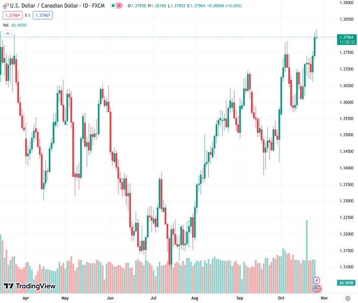 #USDCAD @ 1.37959 pulls back a bit after rising to a seven-month high earlier this Thursday.