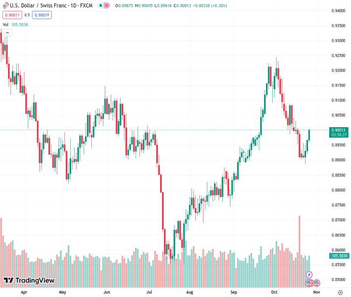 USDCHF currently trading at 0.9002 at the time of writing. Pair opened at 0.8968 and is trading with a change of 0.38 % .