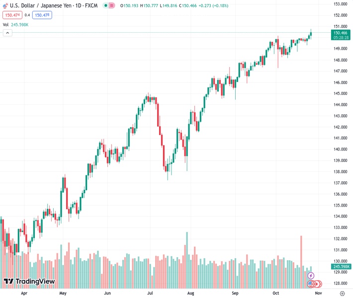 USDJPY currently trading at 150.39 at the time of writing. Pair opened at 150.22 and is trading with a change of 0.11 % .