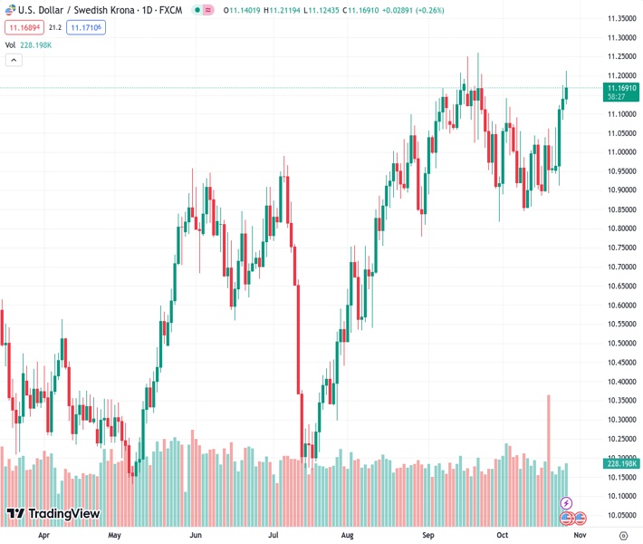 #USDSEK @ 11.16755 jumped to a high around 11.212 and then settled at around 11.180, seeing 0.35% gains.