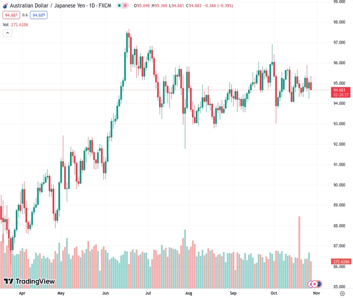 AUDJPY currently trading at 94.76 at the time of writing. Pair opened at 95.08 and is trading with a change of -0.34 % .