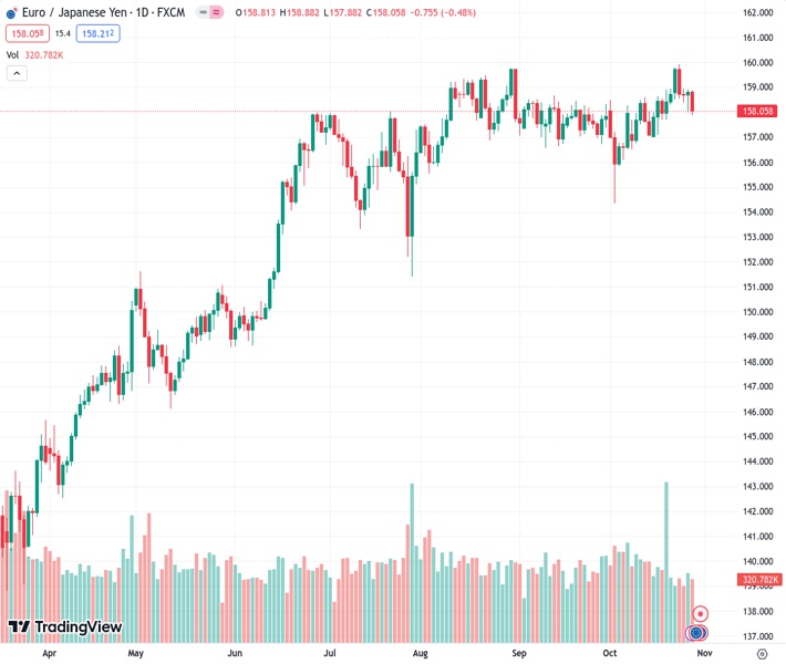 EURJPY currently trading at 158.14 at the time of writing. Pair opened at 158.6 and is trading with a change of -0.29 % .