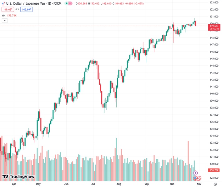 USDJPY currently trading at 149.67 at the time of writing. Pair opened at 150.41 and is trading with a change of -0.49 % .