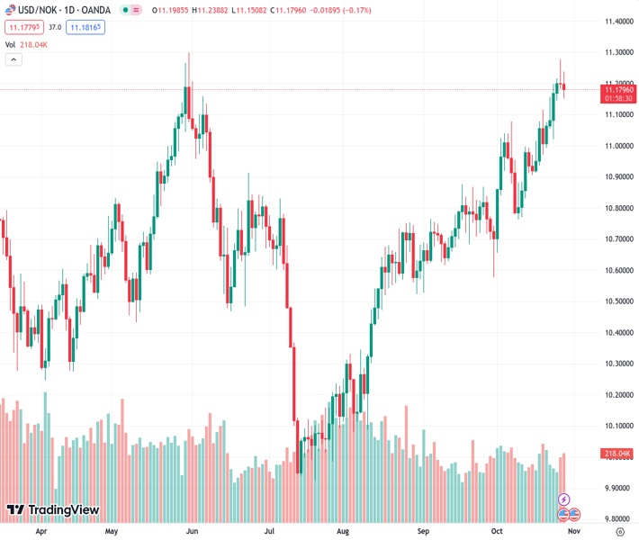 In Friday’s session, the USD/NOK trades with losses, mainly driven by investors taking profits after the pair jumped to its highest level since May 31 on Thursday. Contributing to the downward trajectory, the US Dollar is trading weak after the September Core Personal Consumption Expenditures was reported to have decelerated as expected.