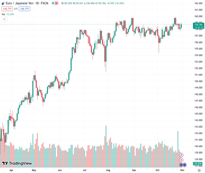 EURJPY currently trading at 158.84 at the time of writing. Pair opened at 158.14 and is trading with a change of 0.44 % .